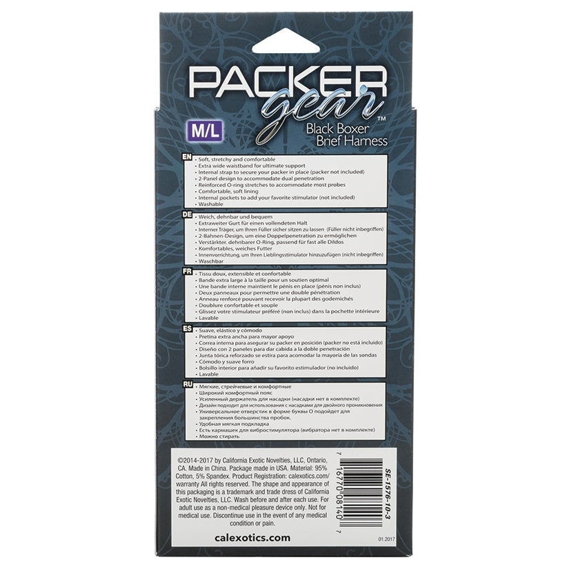 Comfortable and supportive, the Packer Gear Black Boxer Harness is designed for the ultimate instyle and comfort when fashioning your favorite packer or stimulator. The fashionable masculine cut brief has a classic boxer shape, with discreet internal pockets to store your favorite vibrating stimulator. Slip on the boxers, insert a packer, probe or dong, and experience orgasmic one-on-one action. The washable Packer Gear Black Boxer Harness is made from soft, stretchy and comfortable cotton/spandex and has an extra wide waistband for additional support. The boxerÕs soft lining features internal pockets, and an internal strap, to secure your preferred pleasure tool in place. The reinforced 2-panel design also features a super stretchy O-ring that easily accommodates most sizes of penetration pleasure-makers.. Ideal for first time and experienced users, the Packer Gear Black Boxer Harness has no external straps to adjust fully. Instead, the boxer shorts slip on like underwear for the ultimate easy comfort fit. To experience the fun of using the harness to support your erotic activities, all you have to do is select your favorite packer or stimulating toy through the specially-designed support ring. Inserting a vibrating stimulator, into the internal pocket, also means that you enjoy double the ecstasy. Package Weight 4.00 Ounces Package Dimensions 2.00W by 8.50H by 4.00L inches